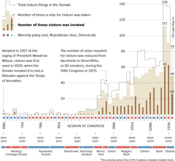 That’s the larger-scale incredulity. On a procedural scale, the question is, depending on the questioner, “How is this happening?” or “Why has this never happened before?” The latter question is better framed as “why has this never happened in this way or on this scale before,” as government shutdowns have occurred several times in the past, most famously when Newt Gingrich’s Republican-majority House sought to punish Bill Clinton in 1995. The House of Representatives has periodically shut down the government for various reasons at various times, and were that all that was happening now, it would not be as worrisome as it actually is. It is worrisome now in a way it has never been before, because it is emblematic of dysfunction that has been growing at an alarming rate since the Clinton presidency. The answer to the first question, “How is this happening?” is simple: it is built into the parliamentary rules of the U.S. government. The shutdown is only symptomatic: in the last five years, we have seen parliamentary procedure in the form of the filibuster being used more than in all of U.S. history combined (well, OK, not that much—but as the graph shows, it has been used a lot); and for those who have the romantic image of Jimmy Stewart in Mr. Smith Goes to Washington, you should know that actual physical filibusters are rare—the “filibuster” now entails cloture motions, which simply use the threat of filibustering to prevent a motion from coming to a vote. (Ezra Klein explains it much better than I can here).