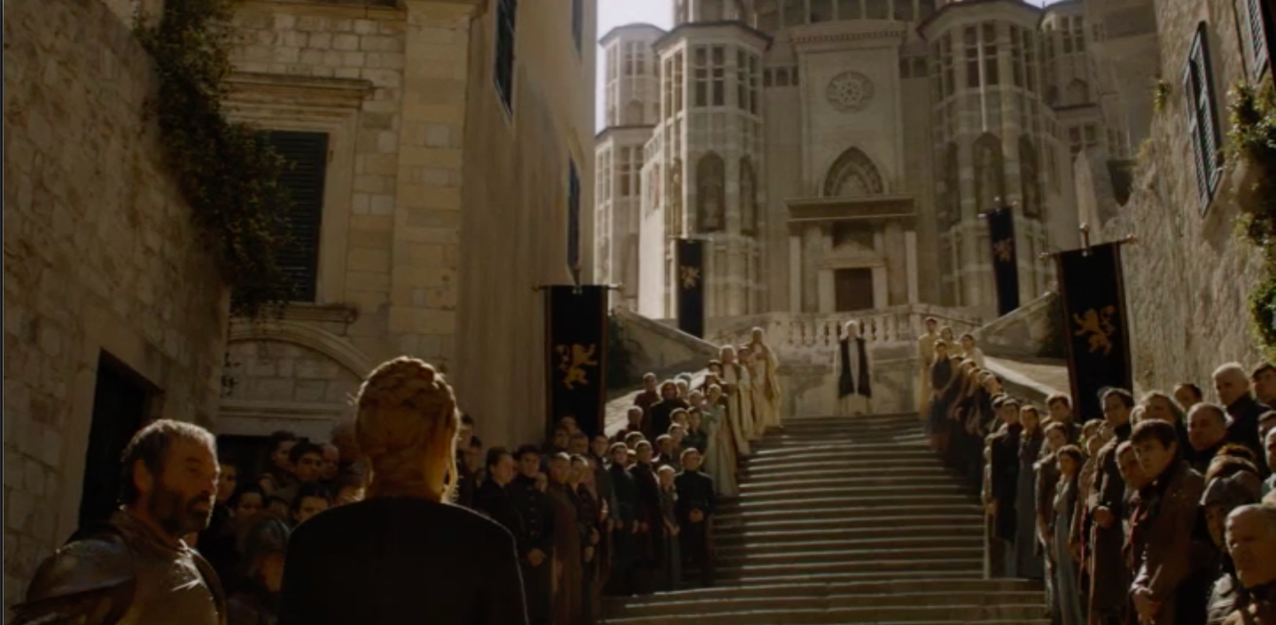 Which brings us back to Cersei, who is drinking rather heavily at her father’s wake and enduring a painfully insincere monologue from Loras Tyrell, telling her what a force he was. And we have our first glimpse of a new religious order in the person of Cersei’s cousin and erstwhile lover Lancel: he comes dressed in penitent’s robe, barefoot, and seeks her out, alone, to offer her his apologies for having tempted her into their “unnatural relations.” And we all snicker a little: as if Cersei was the weak, tempted woman in that relationship. And she herself cannot contain a laugh when Lancel promises to pray for Tywin’s soul. “The day Tywin Lannister’s soul needs your help …” she trails off and sips her wine.
