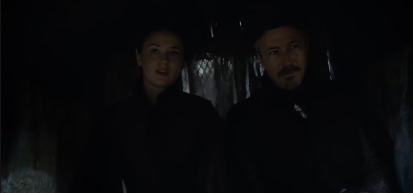 And it is here that we find another divergence from the novels: Littlefinger’s plan to take her far away, not just from potentially treacherous people in the Vale, but far enough away to elude the long reach of the Lannisters, is new. In the novels, Sansa and Littlefinger stay in the Vale and she remains disguised as his bastard daughter Alayne. So where are they now going? Wherever, it will be news to me.