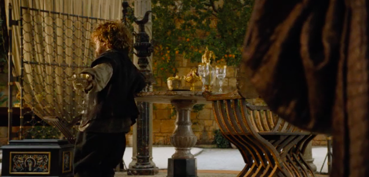 I have to say, I really loved how they introduced this scene, with Tyrion’s claustrophobic POV through one of the holes in his crate. I can’t say I blame him for heading straight for the wine. And the way in which Varys releases him to tumble onto the ground in a mound of straw made me think of The Hobbit when Bilbo releases the thirteen dwarves from the barrels after making their escape from the Elven king.