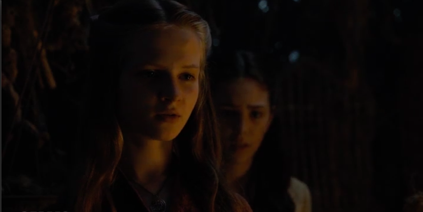 We open with two girls wandering through the woods, one wanting to turn back lest they get into trouble, and the other, golden-haired one a haughty little thing who forges ahead, insisting her father is not a man to be feared. It doesn’t take long to guess that the defiant one is a young Cersei, as much a peach in childhood as she is when she’s grown up, and she’s going to see a witch who will predict her future. She will marry a king, and will become queen. When she asks if they will have children, the witch replies, “No,” and then says he will have 20, and she will have three. The child looks baffled and says that doesn’t make any sense, but we viewers at home nod knowingly — of course they won’t have children, but she will have three children with her brother Jaime, while Robert will populate King’s Landing with his bastards. But her reign as queen will be short-lived: she will be displaced by someone younger and more beautiful, who, she is told, “will cast you down and take everything you hold dear.”