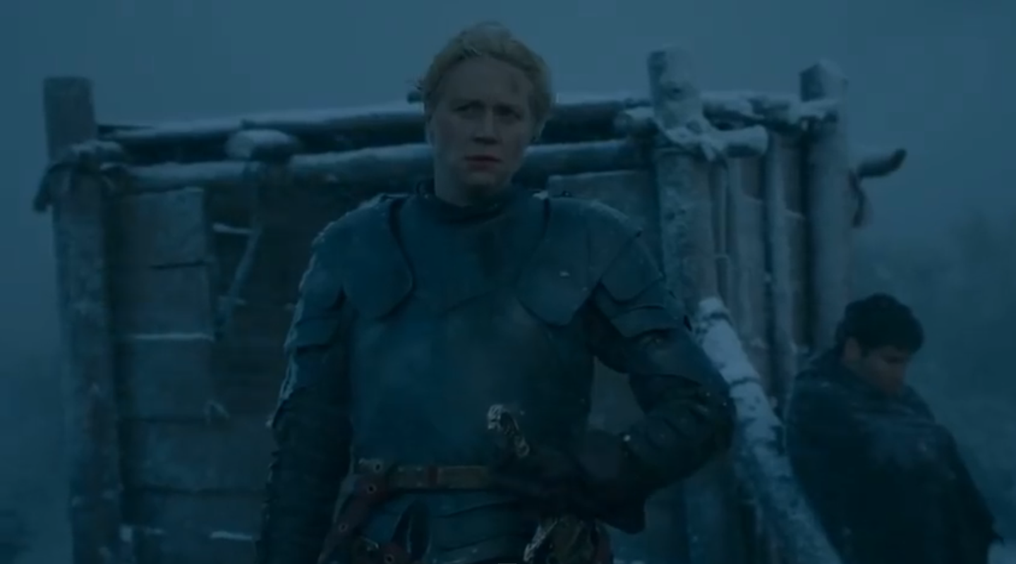 If I can just return for a moment to Brienne’s encounter with Sansa: I can’t emphasize how much of a change this is from the novels, not least because it completely obviates her entire storyline in A Feast for Crows. She’s now found and been rejected by both of the girls she was sworn to protect. In the novels so far she finds neither of them, but has a road-trip tragicomedy with Pod. Now … what? presumably she tries to follow Sansa, as seems to be her intention at the end of this episode, but that doesn’t seem wise. I think I know where she’s heading, however, based on a split second image in one of the trailers. Speculating might seem a bit spoilery, so I’ll just show you the screen cap.
