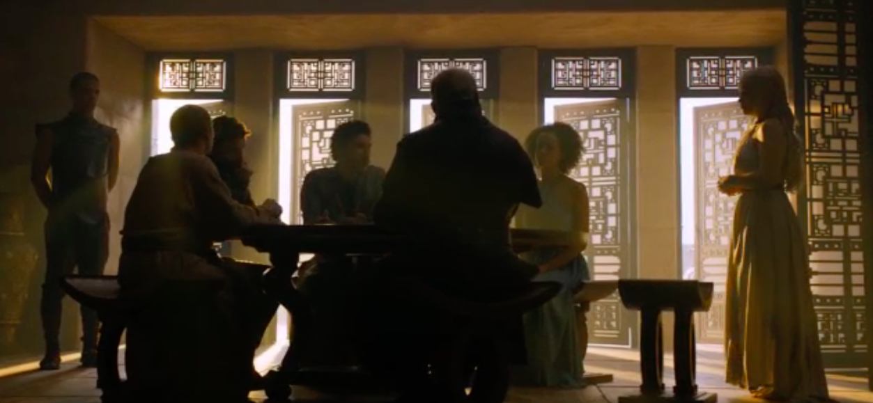 Ser Barristan delivers his speech immediately following a Council session, where Daenerys and her advisors discuss what to do with the man who killed White Rat. The table is split down the middle between those who want him killed, and those who want a fair trial. Mossador, the former slave, argues that this is Meereen, and here, when he was a slave, he worked under people who showed no mercy. Anyone who kills should be shown the same, he says. This man does not deserve a trial, and should be killed to teach a lesson.