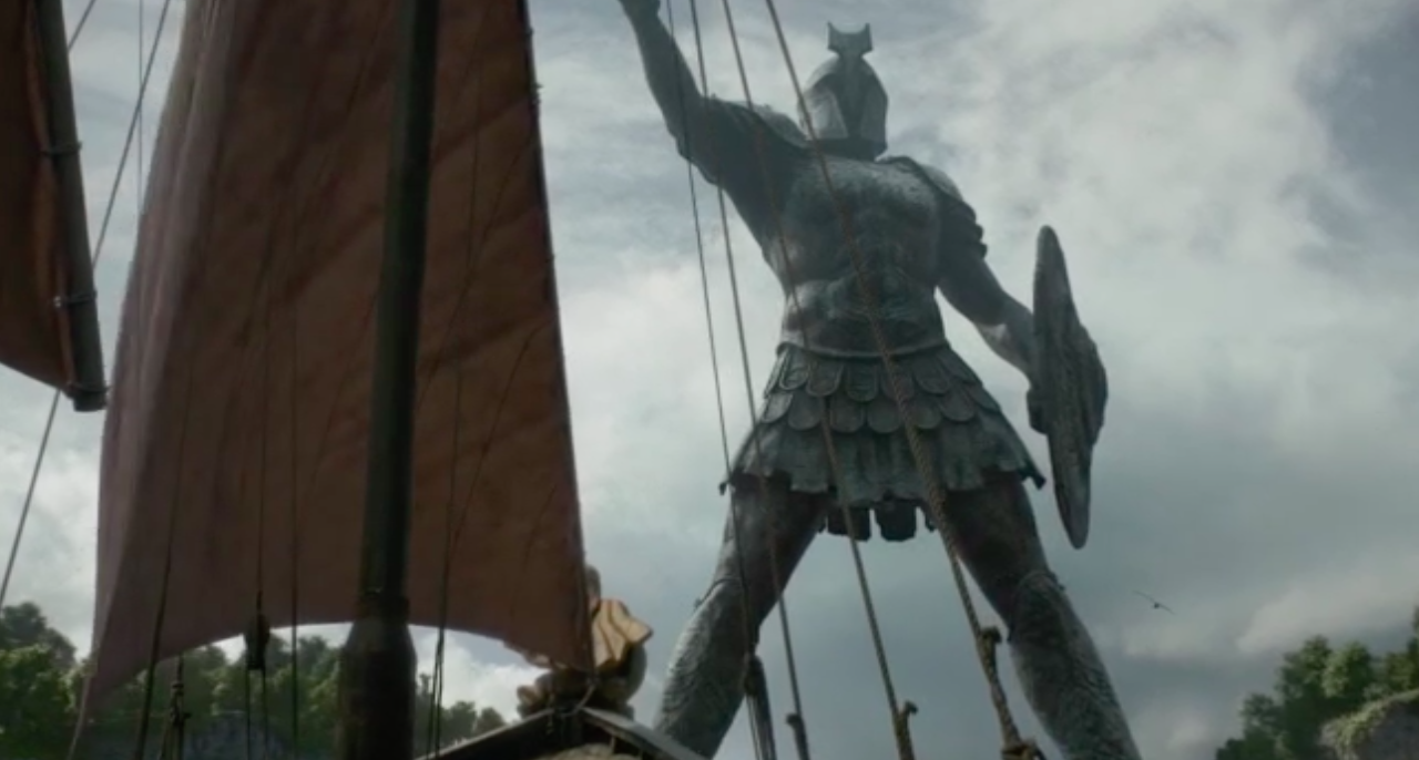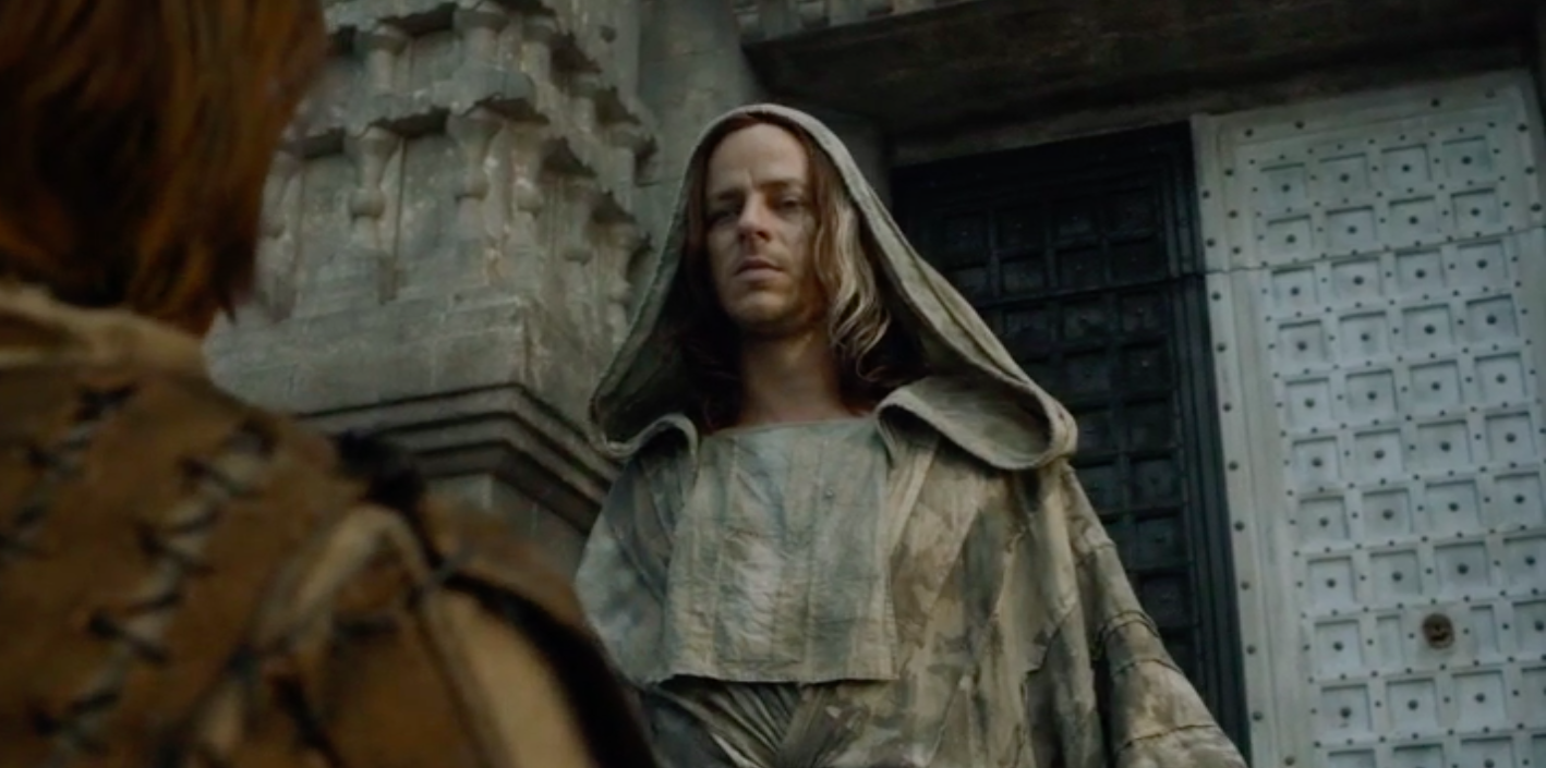 Arya, in spite of her assertion that she’s not afraid, is obviously at the least rather trepidatious, startling when the Titan hails her ship’s arrival with a massive horn blast. The ship captain ferries her to the House of Black and White, waving off Arya’s thanks with “Any man of Braavos would have done the same.” That being said, he is by no means inclined to hang around and make sure everything works out for her, immediately rowing off as soon as he’s said his goodbyes. It’s made a little clearer in the book that the captain has fulfilled something resembling a sacred obligation, but that, his duty done, wants nothing more to do with Arya or her destination. Which makes sense: if this is indeed a house of assassins, I certainly wouldn’t want to linger.