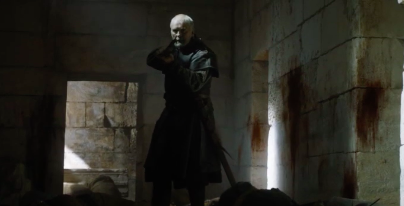 The end of the episode, where we see the Harpies rise up against the Unsullied, is a heartstopping scene. It’s preceded by Ser Barristan regaling Daenerys with the story of her brother Rhaegar, whom she’d always been told was a vicious killer — the one who, as we were reminded at the beginning of this episode, loved Lyanna Stark only to kidnap, rape, and kill her. But now, after hearing that story, the audience hears Ser Barristan tell a very different one. Rhaegar had a beautiful singing voice, he loved singing, and hated the killing. People lavished money on him, which he gave to charities and orphanages. Daenerys sits and listens to Ser Barristan with a starry look in her eye, as amused and thrilled by this story as she was revolted and ashamed of the story that Ser Barristan told her in the second episode of this season about her father. We’re reminded in this scene of how loyal Ser Barristan has been to the Targaryens, and how long he has served her. When she’s called away by Daario, Daenerys smiles at the aged knight. “Go, Ser Barristan,” she says. “Sing a song for me.”
