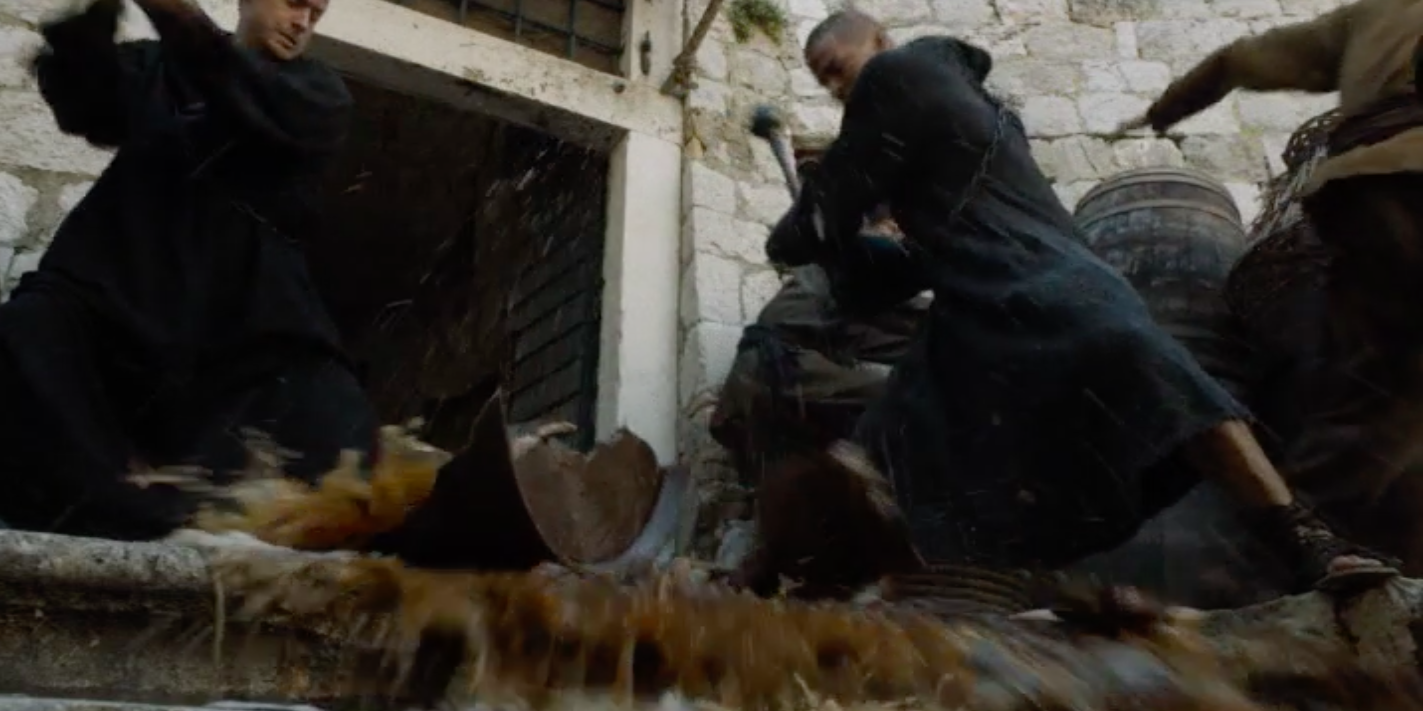 The fight itself is awesome. Grey Worm is a formidable foe, taking down as many as four men at a time, sustaining serious stab wounds and continuing to fight with the focus of a true warrior. Blood is splattered all over the walls, heads are rolling, but it’s still too much. There are 15 men bearing down on him and he can’t take them all on.