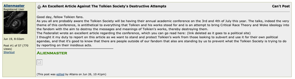 I wish I could offer a useful precis of the paper, which was quite well done, but I was distracted by Zoom’s chat function and the avalanche of commentary scrolling up the side of my screen as I listened to the presentation—many of the comments being from trans and non-binary Tolkien enthusiasts expressing gratitude for a paper that made them feel seen in the context of Tolkien fandom and scholarship. This was actually the general tone of the two-day seminar: not people who, as the conference’s detractors have charged, look to destroy or desecrate Tolkien, but people who love his mythology and want to see themselves reflected within it. And who in the process demonstrated the capaciousness of Tolkien’s vision—one not limited, as the fellow cited above suggests, to the rigid circumscription of conservative Catholicism.