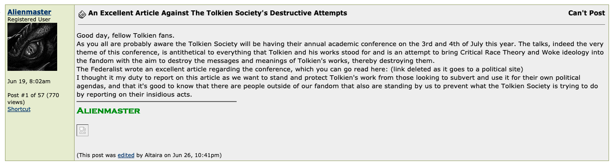 I wish I could offer a useful precis of the paper, which was quite well done, but I was distracted by Zoom’s chat function and the avalanche of commentary scrolling up the side of my screen as I listened to the presentation—many of the comments being from trans and non-binary Tolkien enthusiasts expressing gratitude for a paper that made them feel seen in the context of Tolkien fandom and scholarship. This was actually the general tone of the two-day seminar: not people who, as the conference’s detractors have charged, look to destroy or desecrate Tolkien, but people who love his mythology and want to see themselves reflected within it. And who in the process demonstrated the capaciousness of Tolkien’s vision—one not limited, as the fellow cited above suggests, to the rigid circumscription of conservative Catholicism.