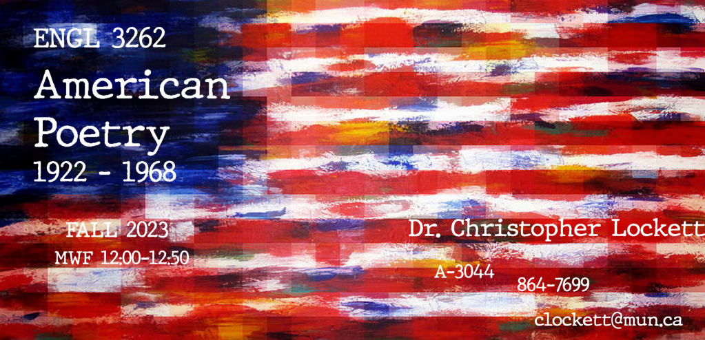 I’m covering the years 1922-1968—basically from the first cannon-shot of modernism (i.e. The Waste Land) to the symbolic end of 60s counterculture, from Pound and Eliot to Ginsberg, with stops along the way at imagism, the Harlem Renaissance, WWII, mid-century women poets, and voices from the Civil Rights era.