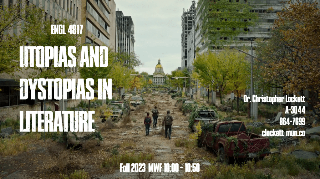 Finally, Utopias and Dystopias. This course was on the books when I started at Memorial eighteen years ago, the creation of a senior colleague now retired. I coveted it from the start, and finally got a chance to teach it in winter 2021. Teaching a course on utopias and dystopias remotely during a pandemic lockdown was … well, a little on the nose, shall we say? Though I was also teaching a graduate seminar on post-apocalyptic literature at the same time, so I was sort of leaning into the theme I suppose.