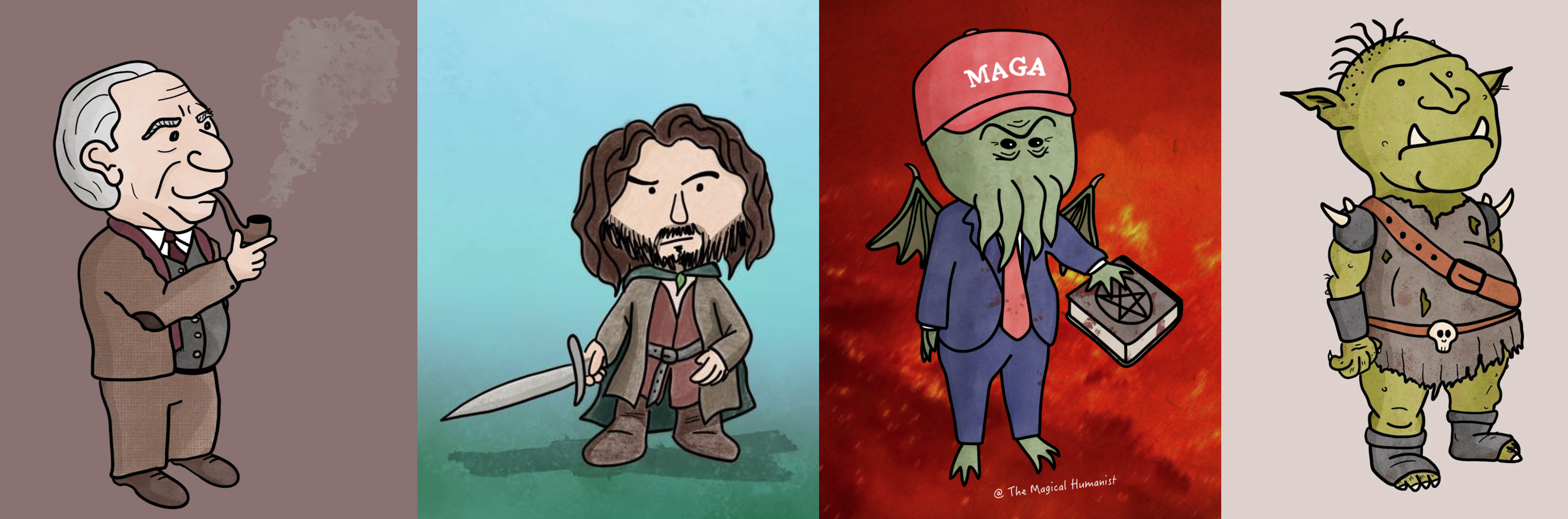 A handful of images from Steph’s slowly growing portfolio: Tolkien with his pipe, a wee cute Aragorn, MAGA Cthulhu, and a somewhat confused orc.