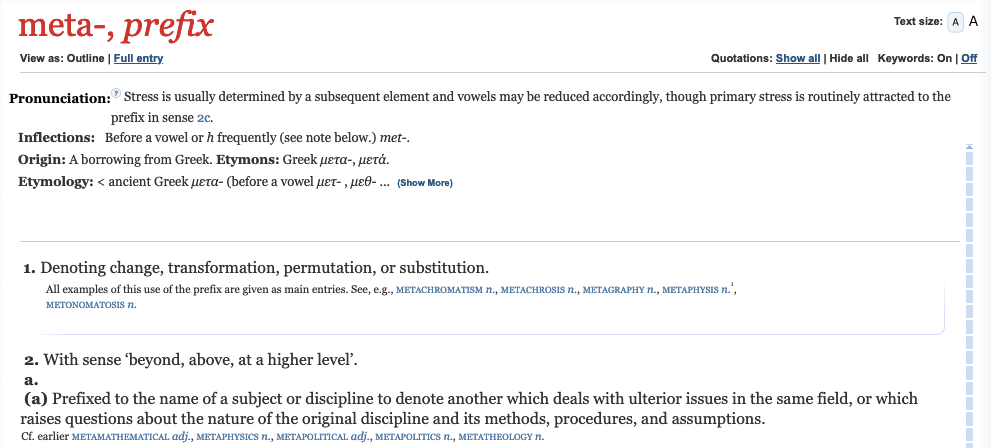What is “meta-“? Notably, in his infomercial and the letter posted to Facebook announcing the rebranding, Zuckerberg says that “meta” is from the Greek and means “beyond.” This much is true: the second entry in the OED’s definition of meta- is “beyond, above, at a higher level.” Zuckerberg goes on to say that, for him, it “symbolizes that there is always more to build, and there is always a next chapter to the story.” Except that that is entirely not the sense in which meta- is used, not even colloquially. It is not uncommon to hear people say things like “that’s so meta!” or “can we get meta about this?” In both cases, what is meant is not a sense of taking things further, but of reflection and reconsideration. “That’s so meta!” is precisely the kind of thing you might expect to hear from someone watching a movie like Kiss Kiss Bang Bang, a noirish murder mystery that constantly draws attention to the tropes, conventions, and clichés of noirish murder mystery, and which further features Robert Downey Jr.’s character frequently breaking the fourth wall to remind us that, yes, we’re watching a noirish murder mystery movie. The suggestion “can we get meta about this?” usually precedes a discussion not of the issue at hand, but rather things surrounding, informing, framing, or giving rise to the issue at hand.