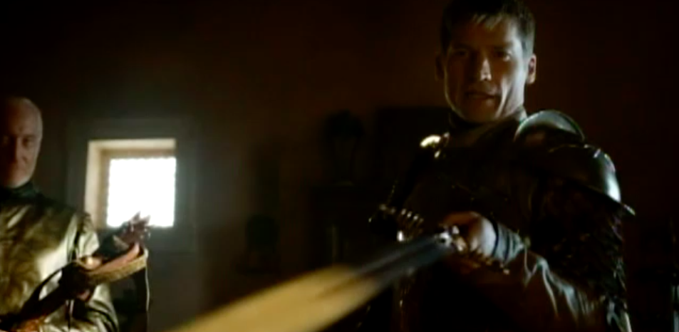 The trial (hilariously sent up as The People’s Court in this week’s Gay of Thrones) is definitely the highlight of the episode, for sure, and one of the highlights of the entire series thus far, but it’s split up: we have the initial scene of Jaime walking Tyrion to the “courtroom” in handcuffs as per Tywin’s orders, with Tyrion announcing loudly, “Well . . . we mustn’t disappoint Father!” Note how when they’re walking down the aisle, someone defiantly shouts, “Kingslayer!” from the crowd. We assume the disdain in that person’s voice means the insult was being thrown at Tyrion, but notice the irony that it used to be the compliment they paid to Jaime Lannister. I guess whether Kingslayer is a good or bad word depends entirely on which king it was that you slayed.