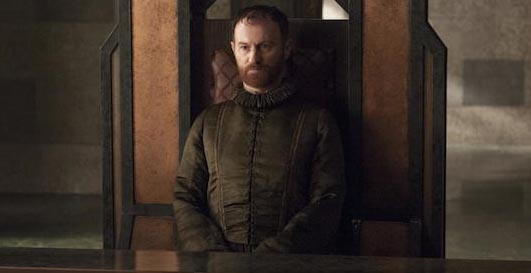 Let’s talk first about Stannis’ visit to the Iron Bank of Braavos, but before I say anything about that I need a little moment to geek out about seeing Braavos appear in the opening credits. This city is one of GRRM’s most intriguing inventions, modeled on late medieval Venice, and about as close to an egalitarian society as one is able to find in that world. Like Venice was in its heyday, Braavos is a hub of commerce, a city run not by hereditary nobility but by its moneymen and merchantmen. And we meet the most powerful of the former. Stannis and Davos cool their heels in an impressively austere room while Stannis paces and complains about being made to wait. Davos is more patient, observing that this is the Braavos way, and starts to relate a story of his smuggling past … and stops, presumably thinking that it might not be the time to remind his king that he used to be a criminal. And then the doors open and in walks … MYCROFT HOLMES! My, but that fellow does get around in the corridors of power. (If only Tyrion could have hired his brother later in this episode).