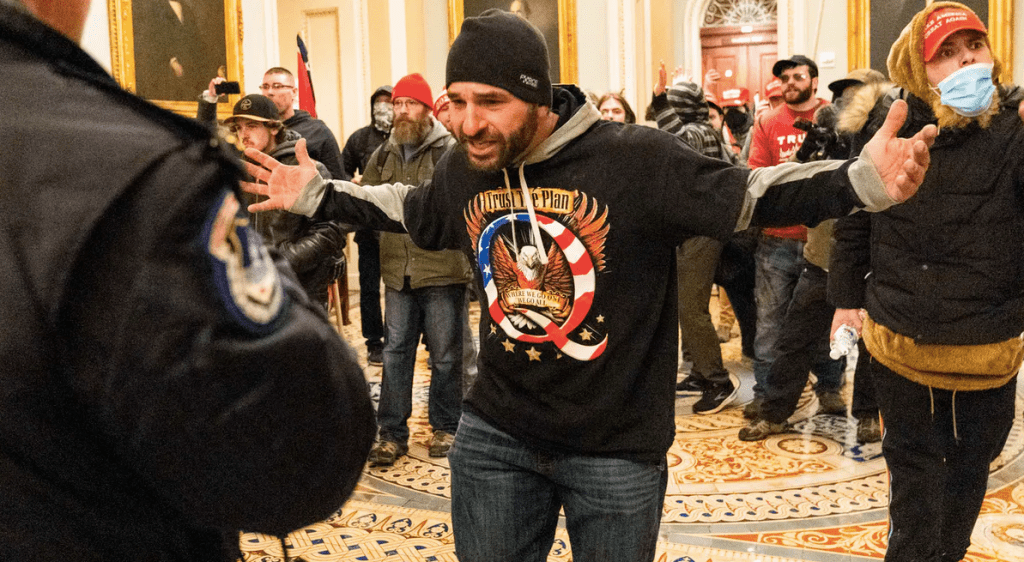 Why Trump? How did such a preening, vain, manifestly physically unfit whiner whose only clothing choices seem to be overlarge blue suits and golfingwear become the object of adulation for hordes of masculinist ammosexuals given to paramilitary cosplay? I think there are any number of answers to that question—not least is the fact that he gave them license to say the quiet part of their racism and misogyny out loud—but I think a big one is that he’s the perfect amorphous vessel for their hatred, resentment, and longing for something that makes sense. In all of the articles I’ve read about the people who stormed the Capitol, all of the interviews with such people I’ve seen, not one person has offered a coherent account of what they want, and what sort of alternative they envision to the current system. They talk a lot about freedom and seem pretty convinced that Biden and his people are determined to take that freedom away, but nothing of what they say bears even a passing resemblance to reality. As for the “coup,” it further appears that the only concrete political goal they have is more Trump. In the QAnon lexicon, Trump is the “god-emperor,” and while that is typical of QAnon’s absurdly hyperbolic discourse, the larger MAGA devotion to him is indiscernible from religious fanaticism.