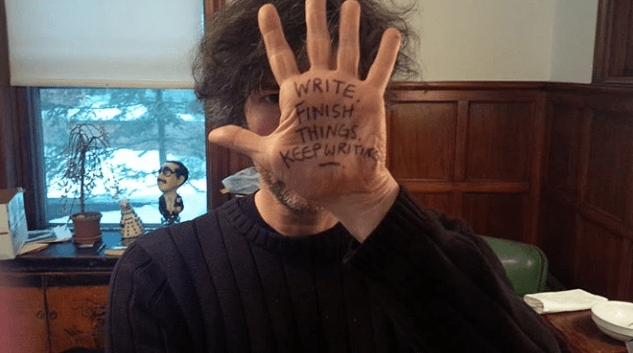 There is also a certain satisfaction in finishing pieces of writing, even when they don’t work out as well as planned. Putting up only fourteen posts in a year when I had a lot on my mind feels insufficient, to say the least. As someone who is easily distracted—though I jokingly compare my research methodology to the dog from Up, it’s not really a joke—completing stuff, however trivial, is a small triumph. A while back, Neil Gaiman posted some basic advice for aspiring writers on social media—a picture of himself with his hand, palm out, in front of his face. Written on his hand: “Write. Finish things. Keep writing.”